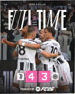 Passano pochi minuti e la Juventus si riprende il pareggio. Corner di Kenan Yldiz e stacco di testa di Kefren Thuram. E, quando il derby d’Italia sembrava concludersi con un pareggio rocambolesco, ecco che dal cilindro del giovane Adzic viene fuori un tiro da fuori area preciso e potente che si insacca nella porta difesa da Sommer.