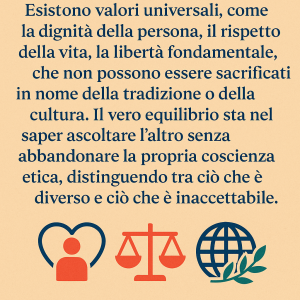 Una terza via: il dialogo autentico. Esiste però una terza via, più esigente ma anche più feconda: quella del dialogo autentico, che si fonda sulla verità e sul rispetto. In questo cammino, si riconosce il valore delle altre culture e religioni senza rinunciare alla propria identità. Non si tratta di rinnegare ciò in cui si crede, né di pretendere che l’altro si adegui, ma di cercare insieme i punti di luce, di bellezza, di giustizia che ogni tradizione può offrire.
