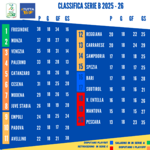 Attardato in classifica c’è l’Empoli. I toscani hanno avuto un impatto altalenante in cadetteria, che ha avuto come conseguenza l’esonero di Guido Pagliuca e il ritorno di Alessio Dionisi. Nella fascia mediana della classifica si attestano due neopromosse, Padova e Avellino, e la Reggiana e la Carrarese. La zona calda, invece, come in ogni campionato cadetto che si rispetti, è cortissima. Le ultime sei formazioni sono distanziate di pochissimi punti. Tre squadre di rango – Sampdoria, Spezia e Bari – si trovano sull’orlo del precipizio, mentre Sudtirol, Virtus Entella e Mantova si trovano un gradino più in basso. Chiude la classifica il fanalino Pescara.
