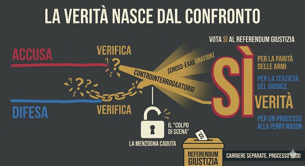 È qui che avviene il “colpo di scena”: attraverso domande incalzanti e logiche, la difesa ha il potere di falsificare la tesi avversaria, facendo emergere incongruenze o menzogne. In un processo accusatorio, la verità non si “riceve”, si “costruisce”. Se una testimonianza non sa resistere all’urto del contraddittorio, non è una verità, ma solo un’ipotesi dell’accusa che cade sotto il peso del dubbio ragionevole.